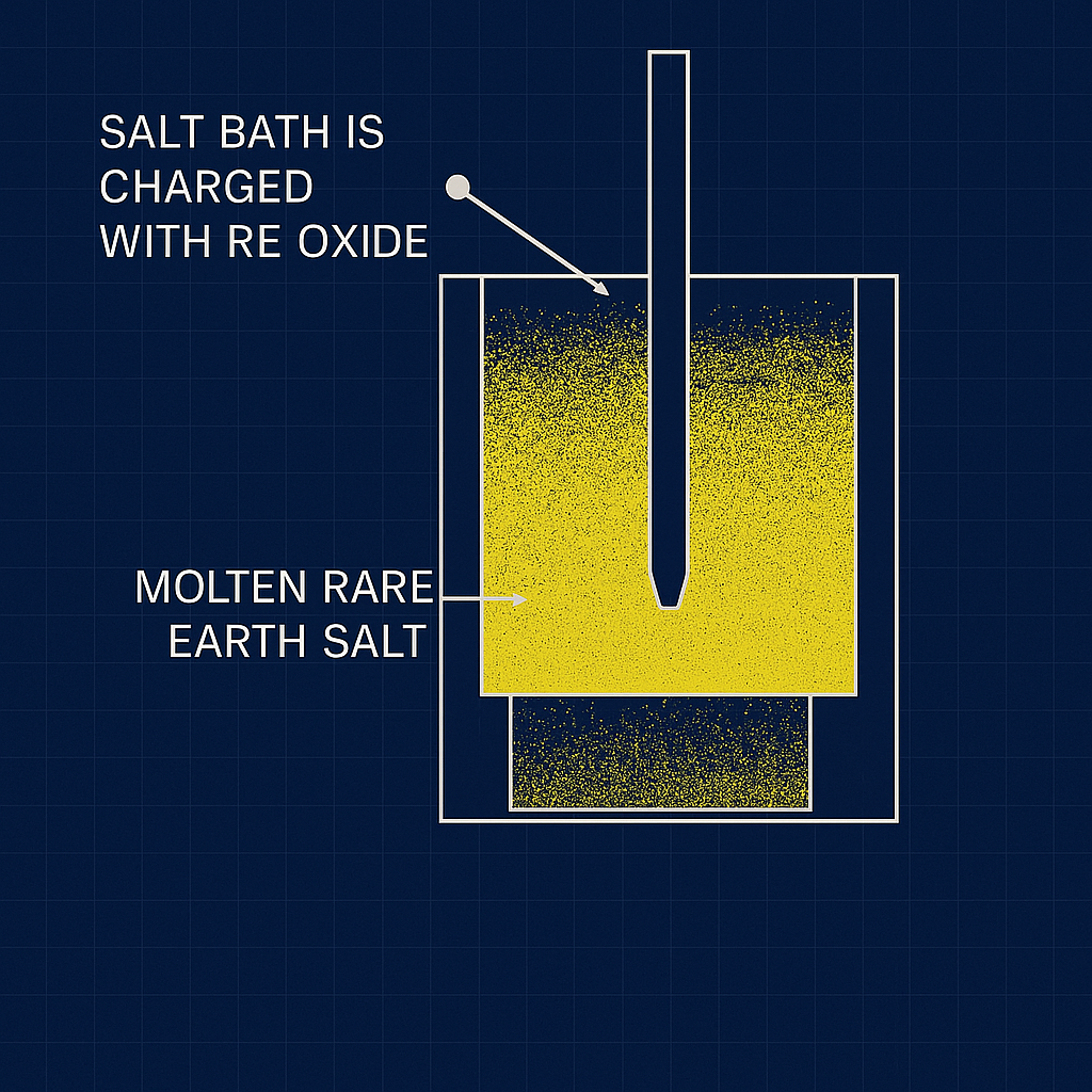 This schematic depicts the initial stage of rare earth metal production. A salt bath is charged with rare earth oxide, which dissolves into a molten salt medium. This forms the foundation for electrochemical reduction, enabling the extraction of high-purity rare earth metals in subsequent steps.